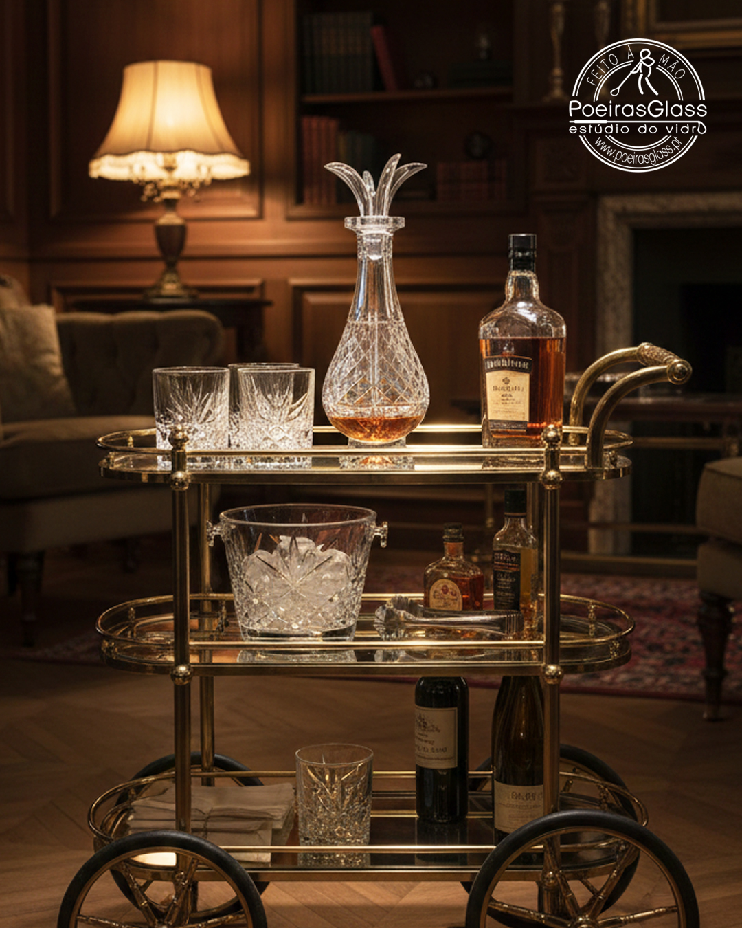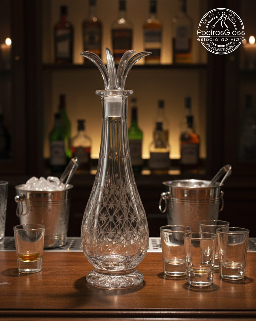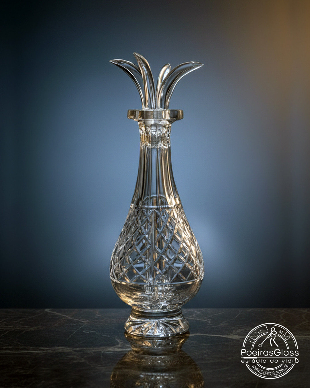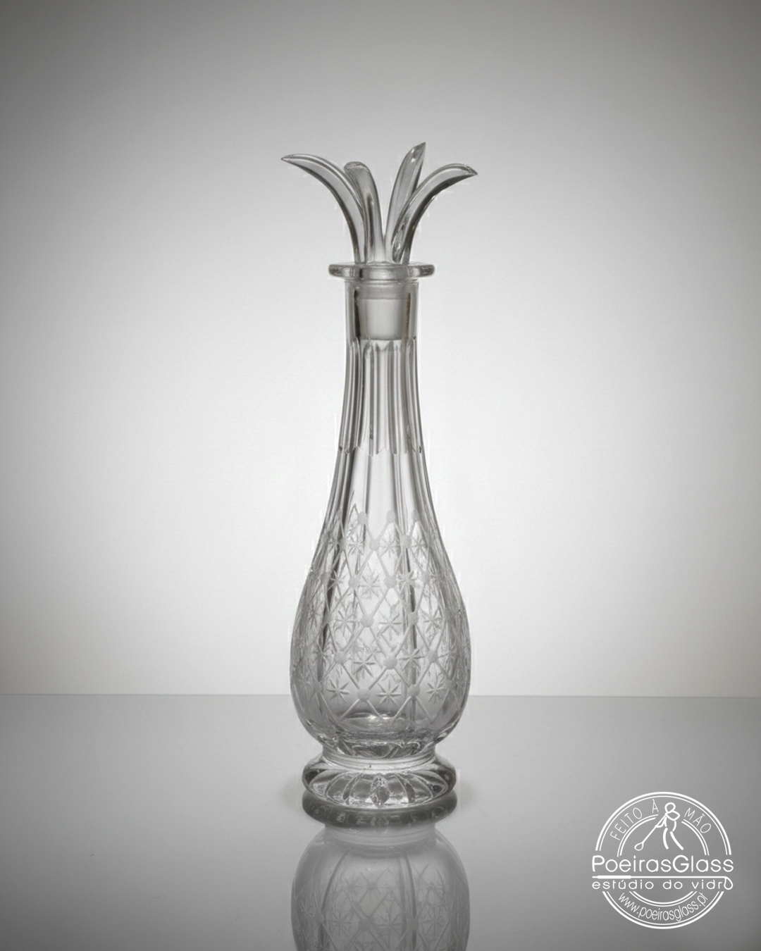Garrafa tem 4 depósitos independentes, ou seja, pode levar 4 líquidos diferentes que nunca se misturam. Posteriormente é Lapidada, retirando vidro à superfície exterior criando relevos e os motivos decorativos.