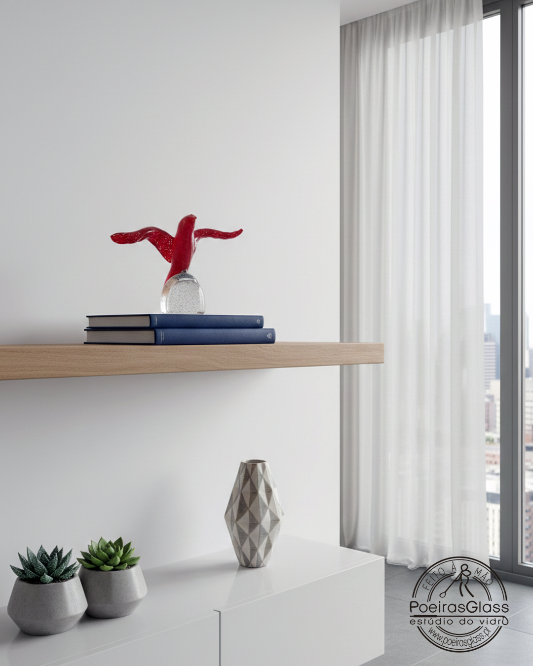 As figuras de animais em vidro da PoeirasGlass são mais do que meros objetos decorativos; são pequenas esculturas que capturam a essência da natureza com a delicadeza e o brilho que só o vidro artesanal consegue oferecer. ​Integrar estas peças num ambiente, como vimos na imagem da sua sala, traz um toque de sofisticação e personalidade.
