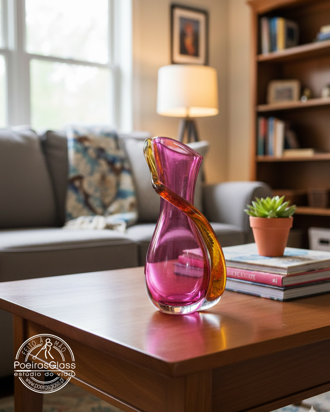 Cada peça da PoeirasGlass é um exemplar único de dedicação e mestria. Mais do que vidro, moldamos luz e cor para transformar o seu espaço num cenário de elegância intemporal.