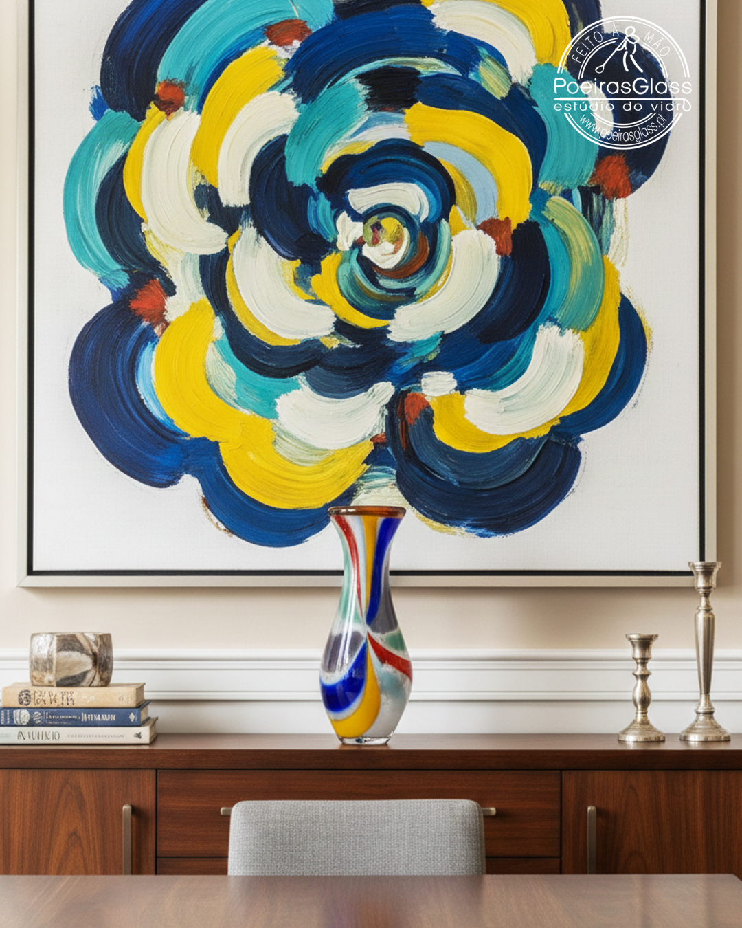Esta Jarra é decorada com bolhas e uma mescla de cores que se fundem em um turbilhão de energia visual, tornando-a numa peça única e irrepetível.